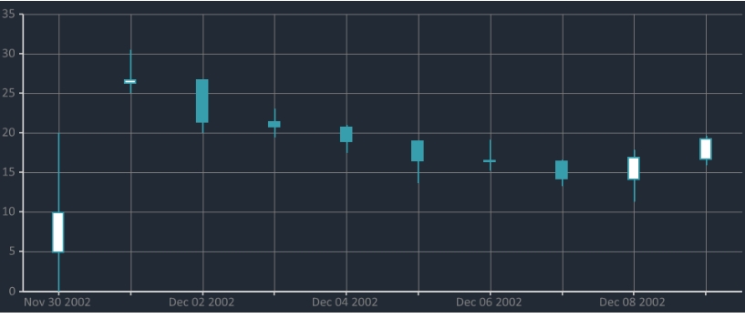 datapoint.addxy("new Date (2002, 11, 10)", new JArray(10, 20, 0, 5).ToString());The first parameter of the addxy method is the X coordinate. The second parameter, is an array that specifies 2 dimensions: the bounds of the small line and the bounds of the big line. For example, the above line will create the following construction: