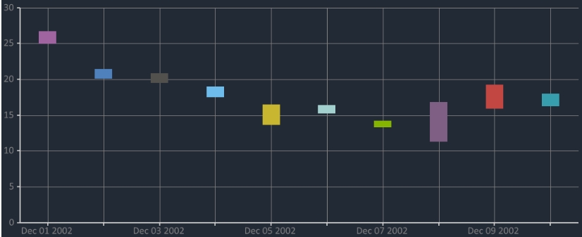 Bunifu Range Column Chart works is pretty simple: we populate the Bunifu Datapoint control with “points”, described by the X coordinate (the first parameter of the addxy method) and an array of 2 coordinates, specifying the limits of the line that we want to represent (on the Y axis).