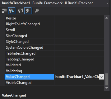 So let’s add that track bar to our form and after we place it on our form, let’s go to “Properties” tab and then on “Events” and then scroll down until we find the ValueChanged event: