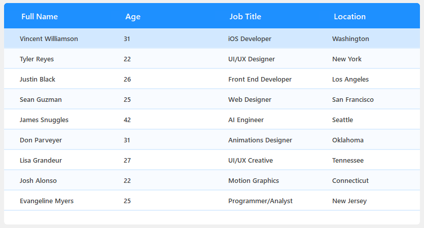 BunifuDataGridView at Run TimeBunifuDataGridView works for both C# and VB.NET. We will use the Form’s Load event to write our sample code to create a BunifuDatagridView and populate the table with built-in sample data.