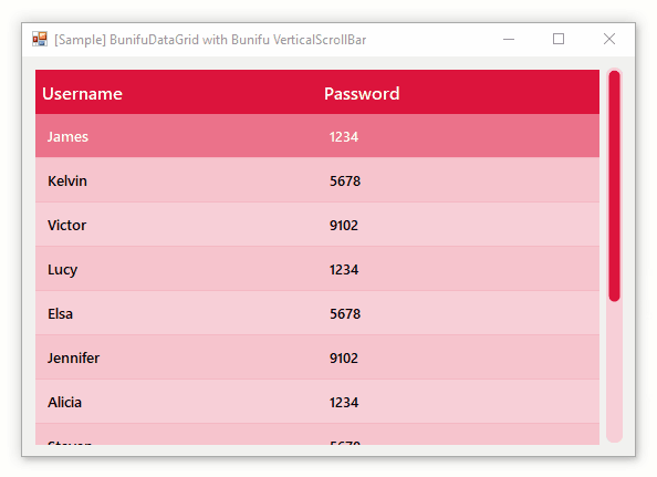 BindTo(ScrollableControl scrollableControl): This method allows you to bind any scrollable container control with a Bunifu vertical or horizontal scroll bar. Example:bunifuVScrollBar1.BindTo(myPanel)bunifuHScrollBar1.BindTo(myPanel)BindTo(DataGridView dataGridView, bool allowSelection)This method allows you to bind any DataGridView control to a Bunifu vertical or horizontal scroll bar. Example:bunifuVScrollBar1.BindTo(myDataGridView)bunifuHScrollBar1.BindTo(myDataGridView)BindingContainer: This property acts as a shorthand option for the above methods, allowing you to bind any supported container control to a Bunifu vertical or horizontal scroll bar.