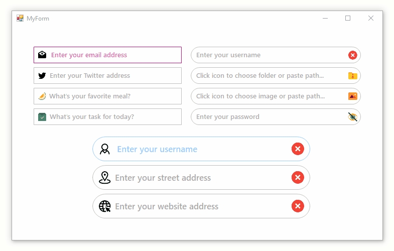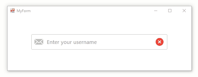 Bunifu Textbox also supports icons that let you provide context to your inputs. You can set these icons to appear on the left and right sides of the control for maximum flexibility. Here's a preview of this feature in action: