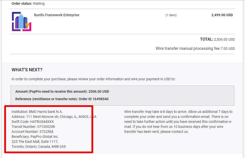 Your selected product will display with pricing details. Select wire transfer payment method from the drop down as shown below