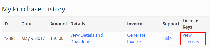 Click on view licenses under My Purchase history table